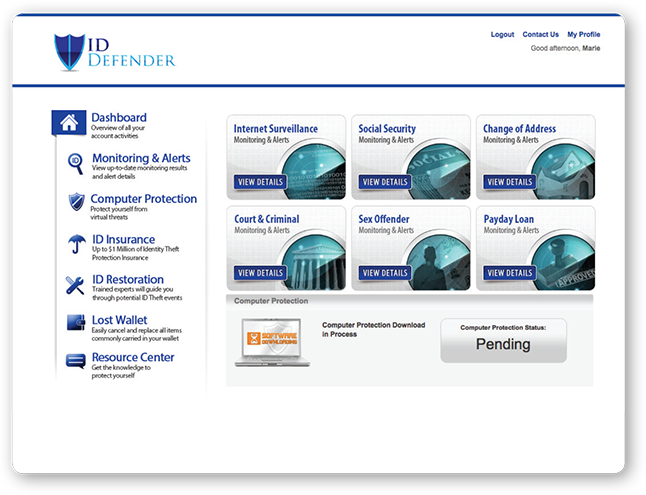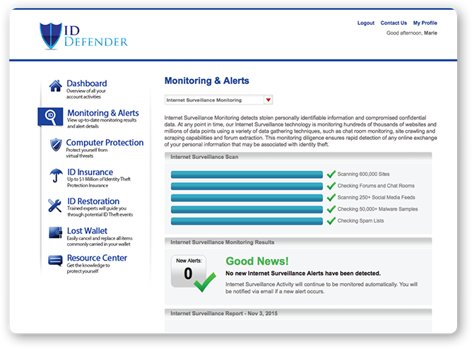 Internet Surveillance Monitoring proactively detects stolen personally identifiable information and compromised confidential data, and alerts are sent if a member’s personally identifiable information is found being bought or sold online.